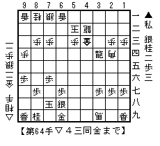 ▲6八玉か▲4八歩などでよかったが、なぜか▲6三金!他に▲6四桂!などを考えていたのだから幸せすぎる。打った瞬間△4九飛の王手馬取りに気づくが後の祭り。