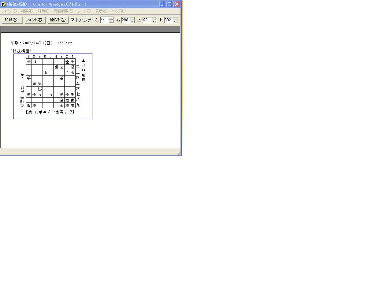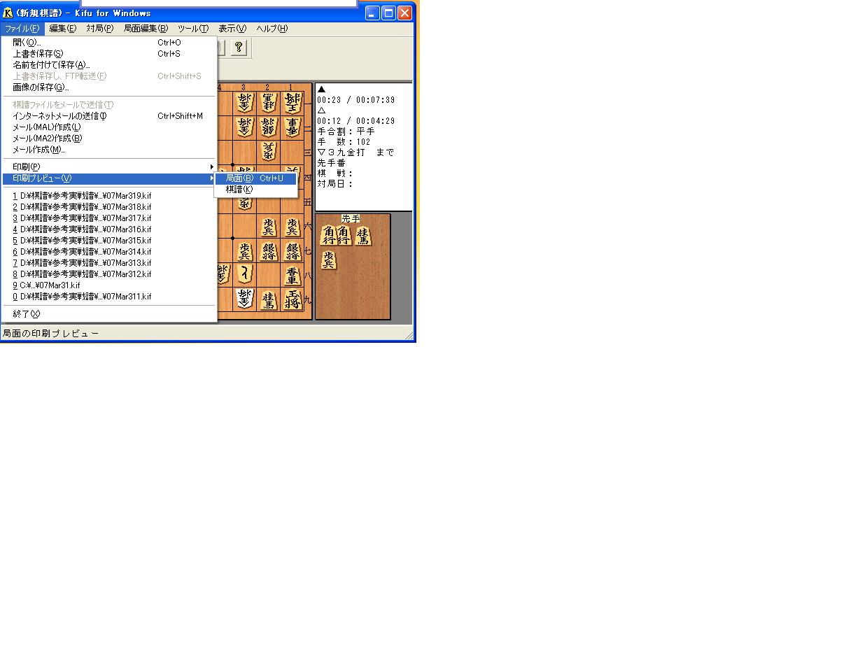 ③ 局面ができたら「ファイル」⇒「印刷プレビュー」⇒「局面」の順にクリックします。