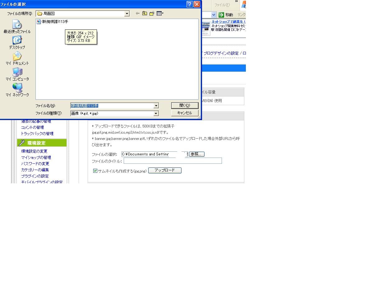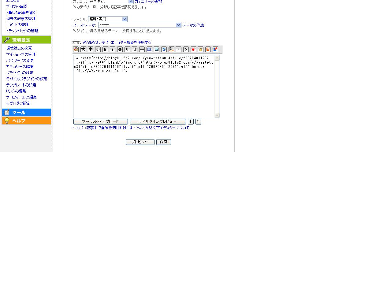 ③ 記事を書く欄の下に「ファイルのアップロード」のボタンがありますのでそれを押すと、「アップロードするファイルの選択」と表示されますので、「ファイルの選択」の右側の「参照」というボタンを押し、保存した画像をクリックします。そうすると、「ファイルの選択」の右側の空白になっている場所に、画像の保存してある場所が表示されますので、その下にある「アップロード」のボタンをクリックしてください。